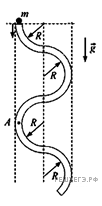 - В вертикальной плоскости расположена гладкая трубка, изогнутая периодически в виде дуг окружностей одинаковым радиусом R (см. рис.). В верхнее отверстие трубки без начальной скорости запускают шарик массой m = 10 г. С какой по модулю силой F шарик действует на трубку в точке А, в конце первого периода своего движения по трубке?
